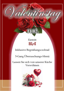 Freuen Sie sich zum Beispiel auf einen liebevoll gestalteten Valentinsabend mit Begrüßungscocktail und 3 Gang-Überraschungsmenü, auf unsere Dancing Night mit Musik, Tanz und Unterhaltungsprogramm oder auf einen irischen Abend mit Live-Folk, irischem Bier und passenden Spezialitäten. Ob zu zweit, mit der Familie oder in fröhlicher Runde: Bei uns sollen Sie sich einfach wohlfühlen.